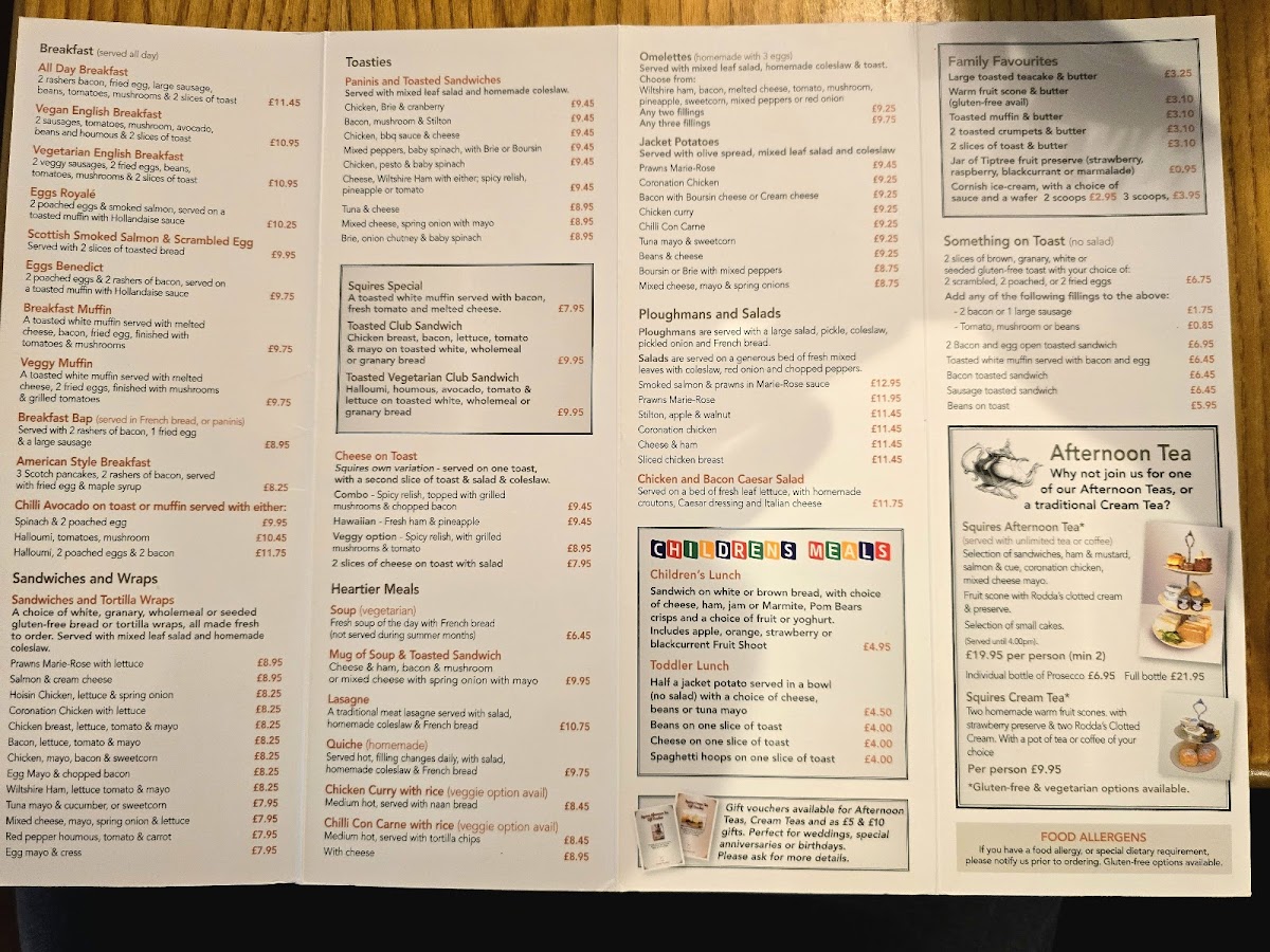 What sets Squires apart is their attention to quality and value-generous portions, freshly prepared ingredients, and consistently warm service. Their Homemade Cakes (from £3.50) and Cream Teas (£5.95) are local favourites, ideal for an afternoon treat with a pot of English tea or a barista-style Latte or Cappuccino (£2.80-£3.20).